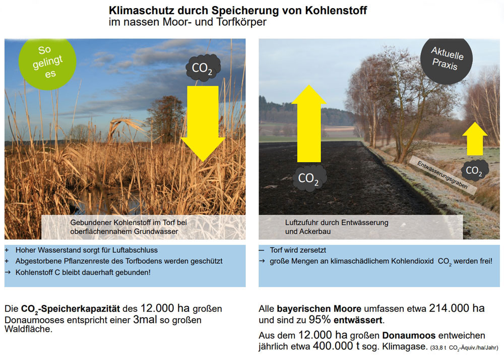 Nach den aktuellen und vergangenen Hochwasserereignissen fordern immer mehr Fachleute, Organisationen, Wasserverbände und Privatleute die Bayerische Staatsregierung auf, dringend notwendige Maßnahmen zum Hochwasserschutz anzugehen. Die Forderungen beziehen sich nicht nur auf technische Bauwerke, sondern auch auf Bereitstellung von Überschwemmungsflächen, d.h. den Boden als Wasserspeicher zu nutzen. Dazu gehören auch die zur landwirtschaftlichen Nutzung trockengelegten Moorböden. Renaturierte Moore können ein vielfaches an Wasser schwammartig aufsaugen und speichern. Allerdings werden Acker- und Wiesenflächen durch die immer größer und schwerer werdenden landwirtschaftlichen Maschinen zunehmend verfestigt. Bei Starkregen kann das Wasser nicht mehr aufgenommen werden und fließt oberflächlich ab, der Boden wird weggeschwemmt. Die braunen Fließgewässer beweisen diesen Vorgang.