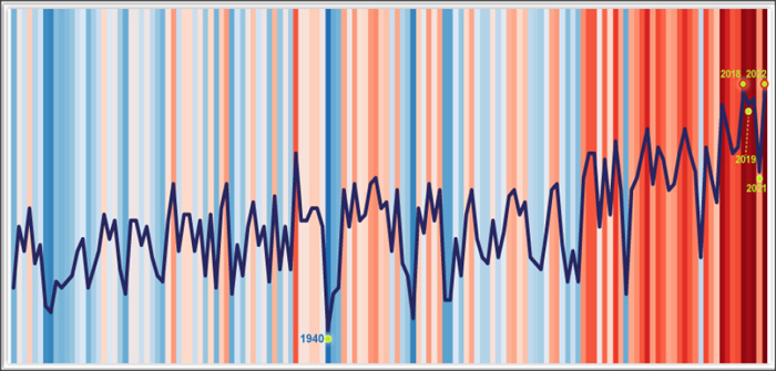 Erwärmung in Deutschland dargestellt als „Warming Stripes“ für den Zeitraum 1881 - 2022. (Quelle: DWD, basierend auf jährlichen Gebietsmittelwerten der Temperatur) Darstellungsidee von Ed Hawkins